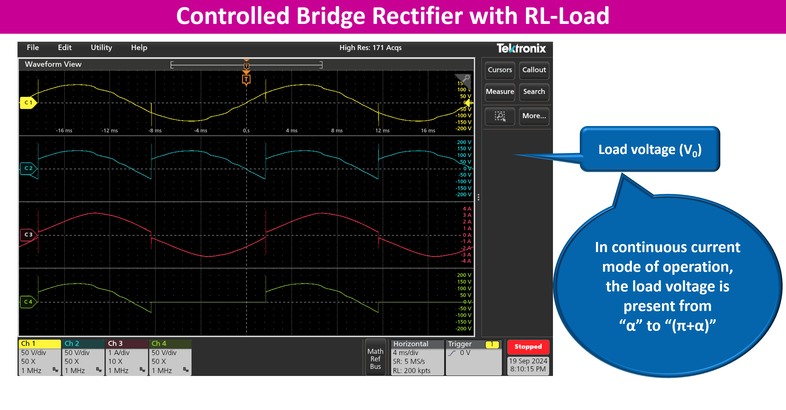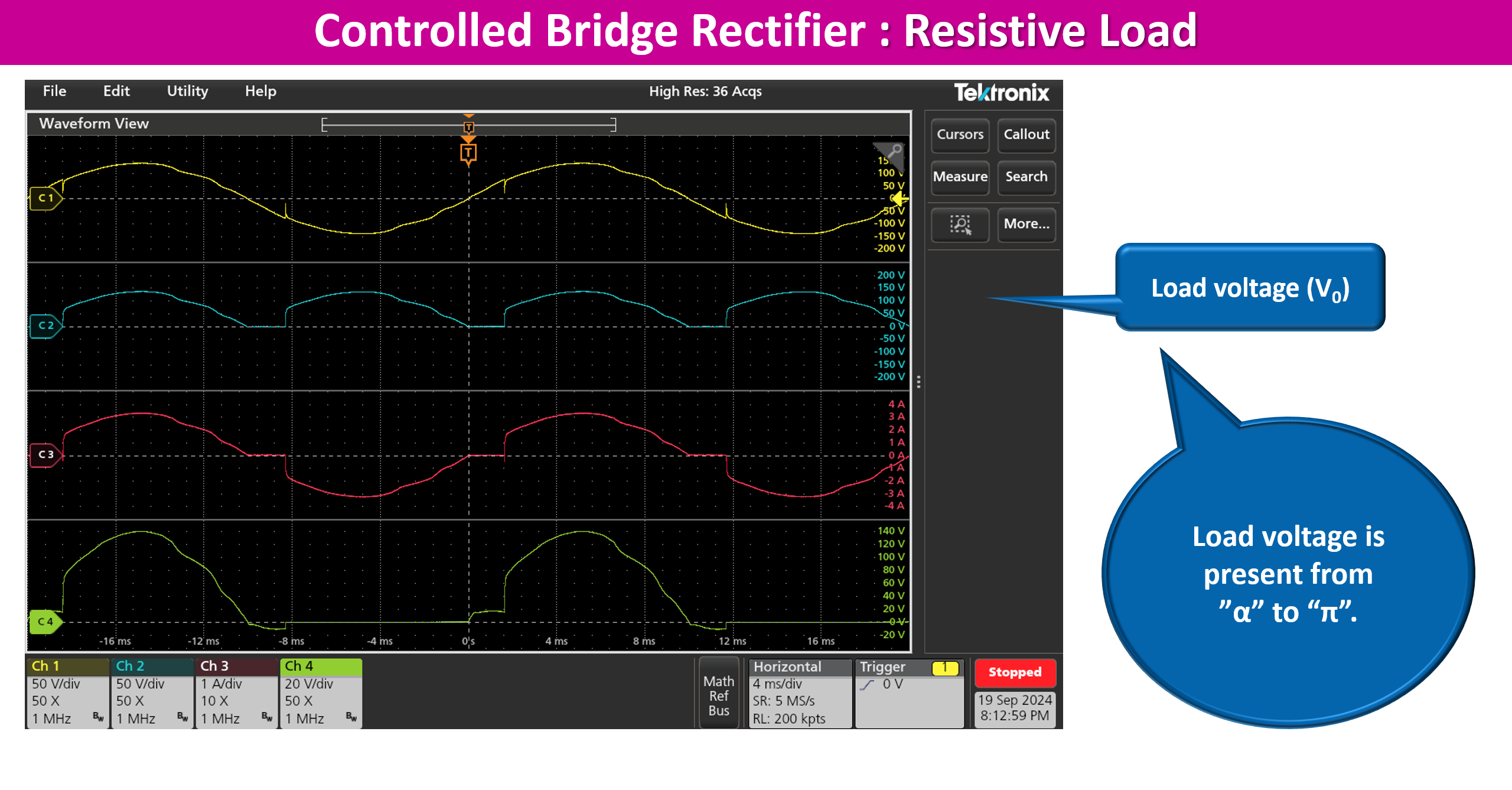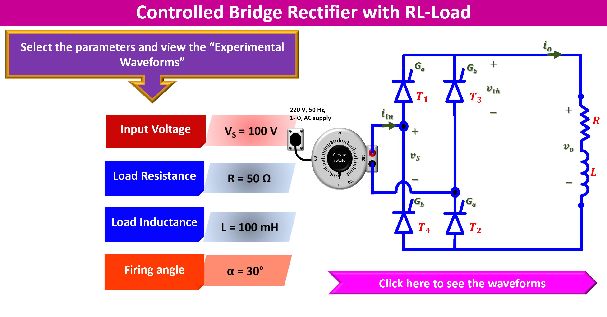 | S.No. | Vac(V) | Firing angle (Ξ±) | Vdc(V) | Idc(A) | Vrms(V) | Irms(A) | Power(Po) (W) | Apparent Power (S) (VA) | PF |
