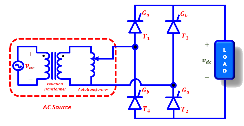 Fig. (2) shows a fully controlled bridge rectifier, which uses four thyristors to control the load voltage. Thyristors T1 and T2 must be fired simultaneously during the positive half cycle while Thyristors T3 and T4 must be fired simultaneously during the negative half cycle of the source voltage. All the thyristors must be given firing pulses of suitable pulse sequence.