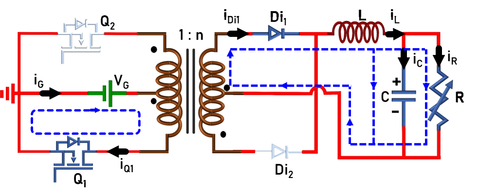 ![]() Fig. 2(a). Circuit in mode-I (Q1- ON, Q2- OFF). |