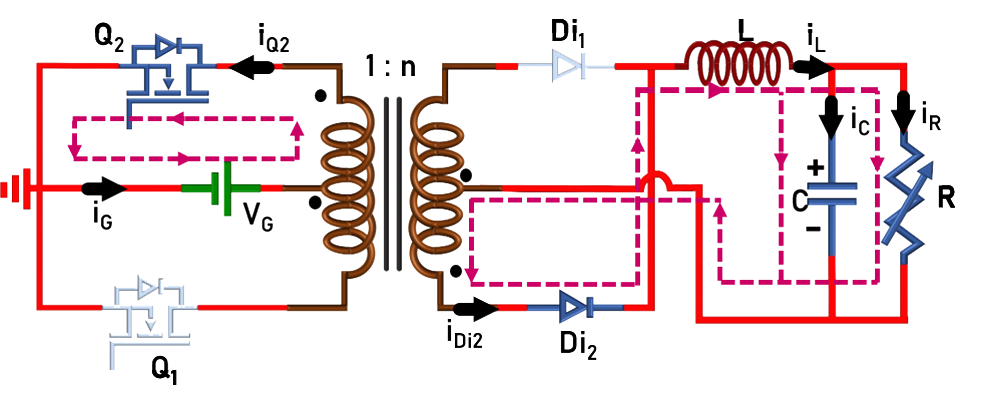 The switches (Q1 and Q2: ON/OFF-state) are turned-ON/OFF using 180° phase shifted PWM signals. The converter operation can easily be understood from the following equivalent circuits. Brief mathematical analysis is given below.