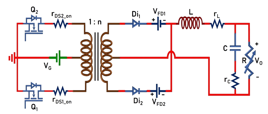 Fig. 4. Circuit Diagram of Push-pull Converter with non-idealities.
