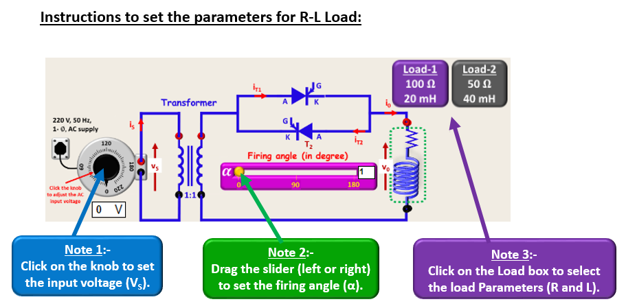 - Set the values of source voltage (VS), type of load (R or R-L) and firing angle (α : 0° to 180°).