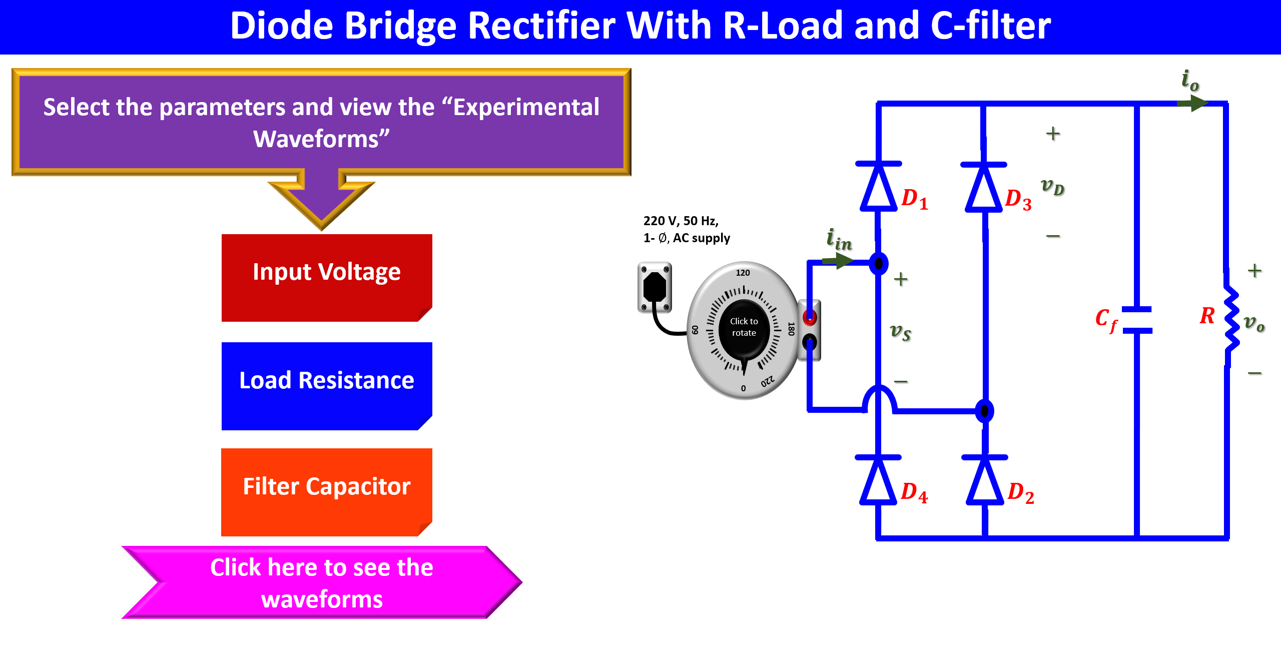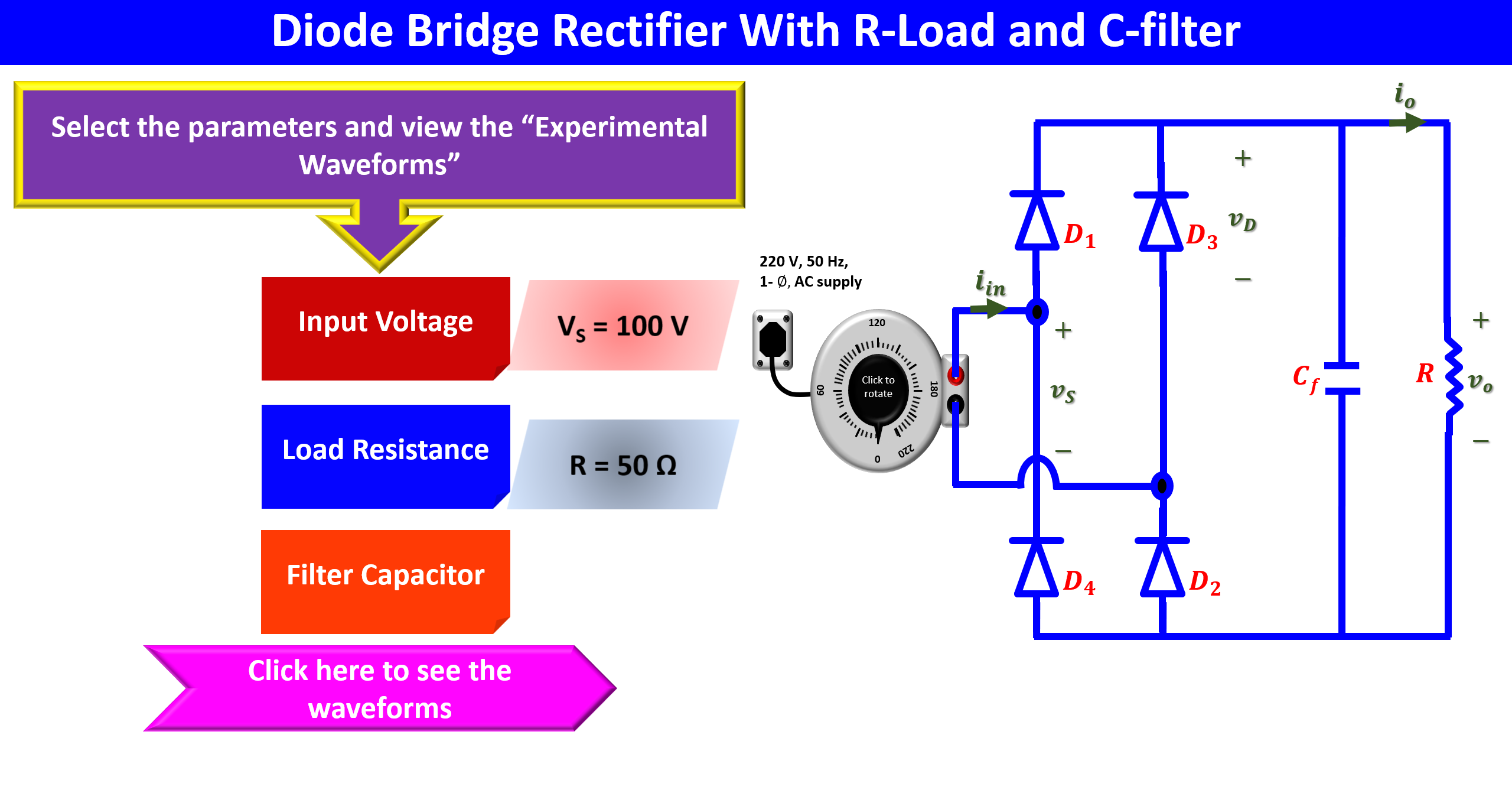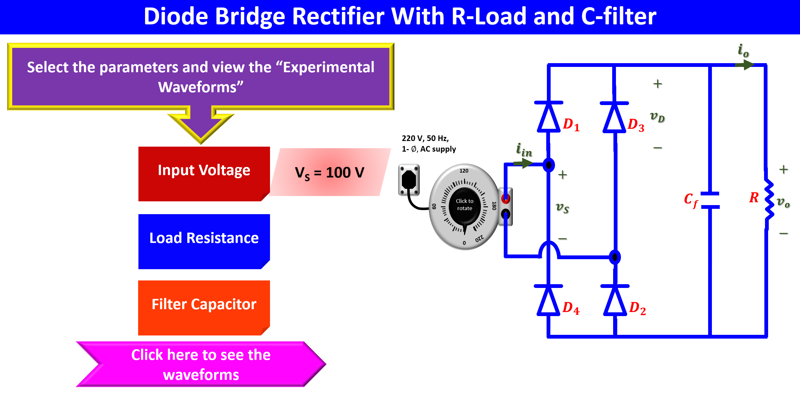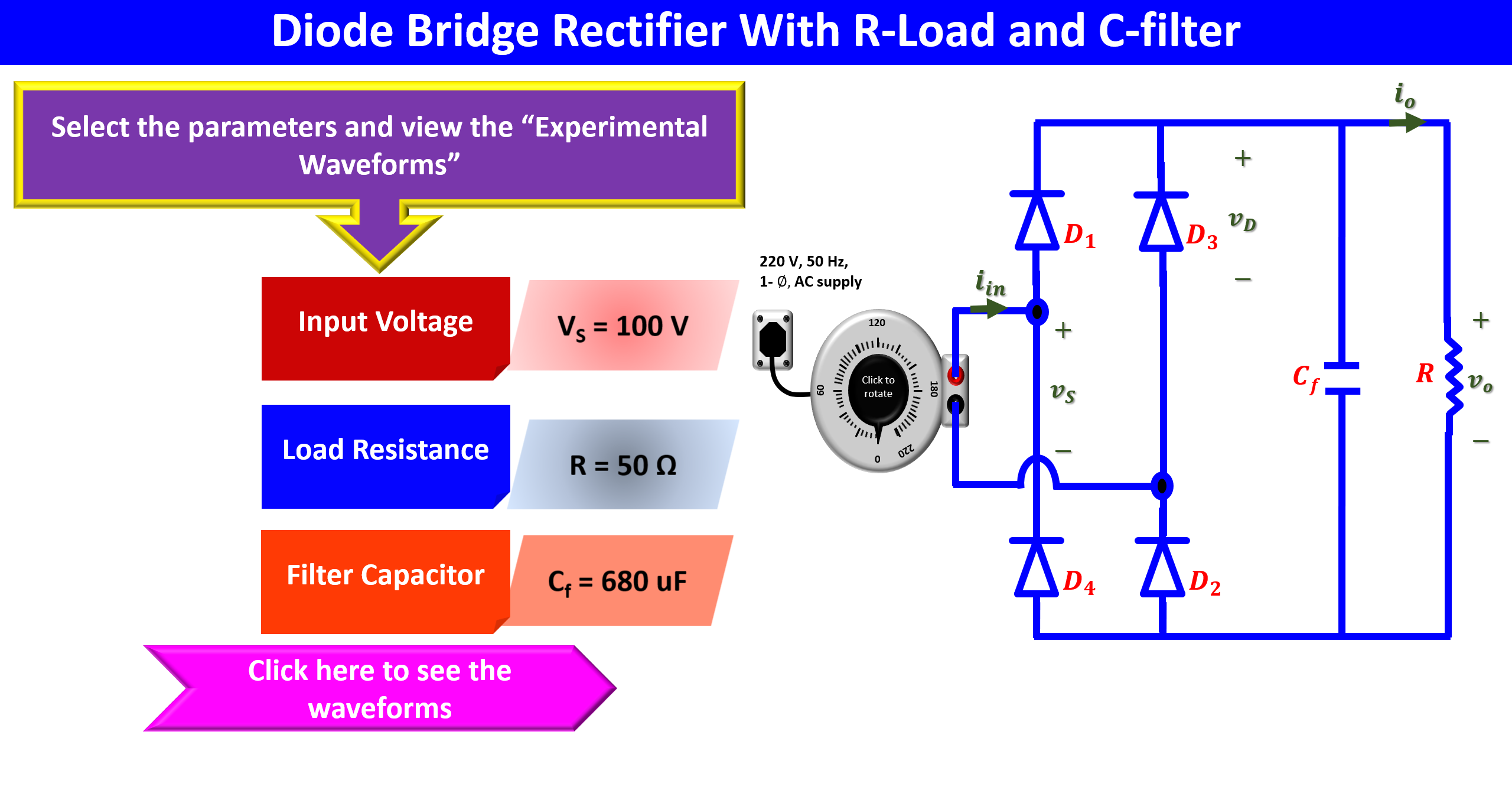 | S.No. | Vac(V) | V0(V) (Without filter) | I0(A) (Without filter) | Vr(pp) (Without filter) | P0(W) (Without filter) | VoF(V) (With filter) | IoF(A) (With filter) | Vr(pp)F (With filter) | PoF(W) (With filter) |